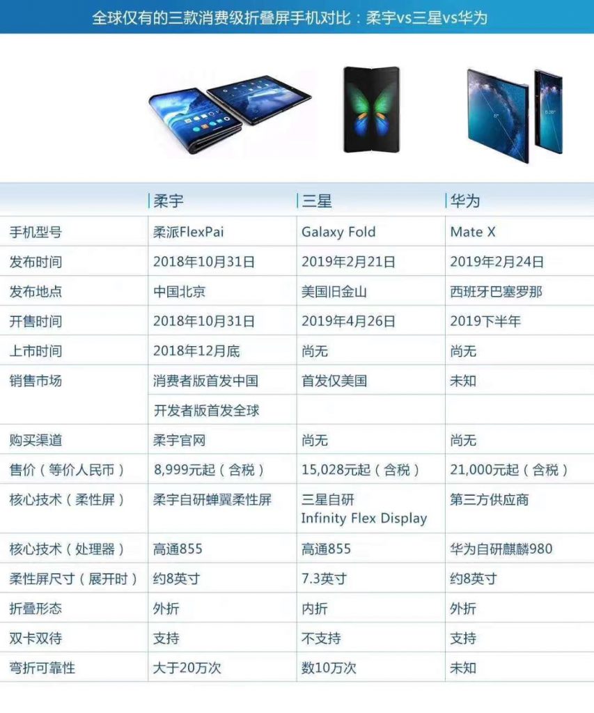 作为国际上最早推出量产的柔性手机厂商,柔宇科技创始人刘自鸿在微博发布了一张参数比照图,对此了华为Mate X、三星Galaxy Fold与柔宇自家的柔派FlexPai。在比照图中柔宇侧重突出了自家产品的优势,包含全球首发、价格、双卡双待与可弯折次数。其间三星华为价格超越1万5,柔宇只需8999元,价格要低上许多,而三星不支持双卡双待且屏幕弯折次数只需数十万次,柔宇则能够弯折超越20万次。刘自鸿表明产品价格很重要:“作为好产品,当然终究都要回归一点,便是让用户买得到,买得起,用得好。”