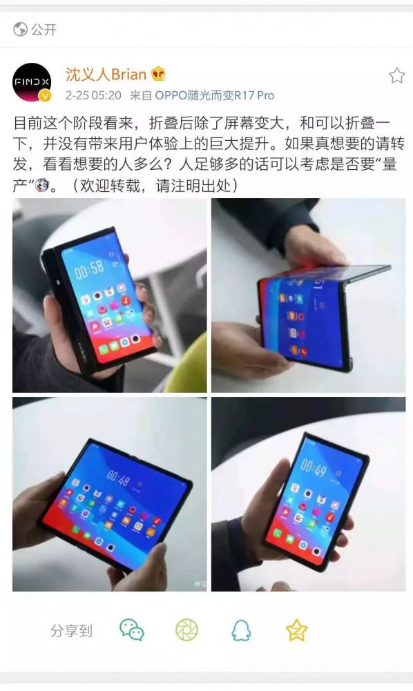 值得重视的是,在华为发布折叠屏手机不久后,OPPO副总裁沈义人也在交际媒体上发布了OPPO的“折叠屏手机”——假如想要的人够多能够考虑“量产”。原因是他以为现阶段的处理方法不适合作为一个消费级产品的运用处理方案,关于手机职业来说,这可不仅仅是换一个屏幕的工作。